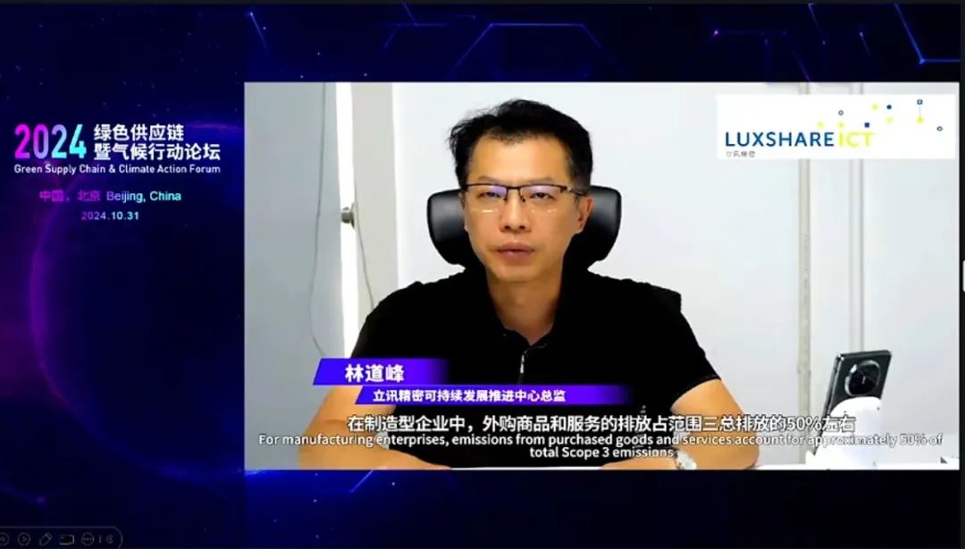 在綠色供應(yīng)鏈暨氣候行動論壇活動期間,立訊精密可持續(xù)發(fā)展推進(jìn)中心總監(jiān)林道鋒分享了立訊精密在綠色供應(yīng)鏈管理方面的良好實踐,助力各行各業(yè)企業(yè)落實供應(yīng)鏈環(huán)境和氣候承諾。