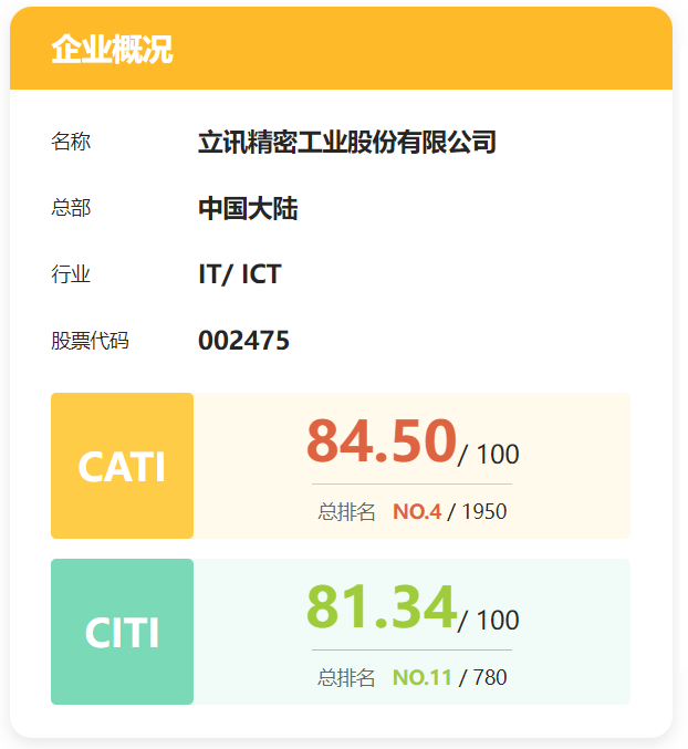 2024年10月31日,公眾環(huán)境研究中心(IPE)在北京發(fā)布綠色供應(yīng)鏈CITI指數(shù)和供應(yīng)鏈氣候行動CATI指數(shù)2024年度報告,本期評價覆蓋23個行業(yè)的780家中外企業(yè)。立訊精密供應(yīng)鏈氣候行動CATI指數(shù)位列全行業(yè)第四名,綠色供應(yīng)鏈CITI指數(shù)位列全行業(yè)第十一名,整體表現(xiàn)連續(xù)多年領(lǐng)跑大中華區(qū)。