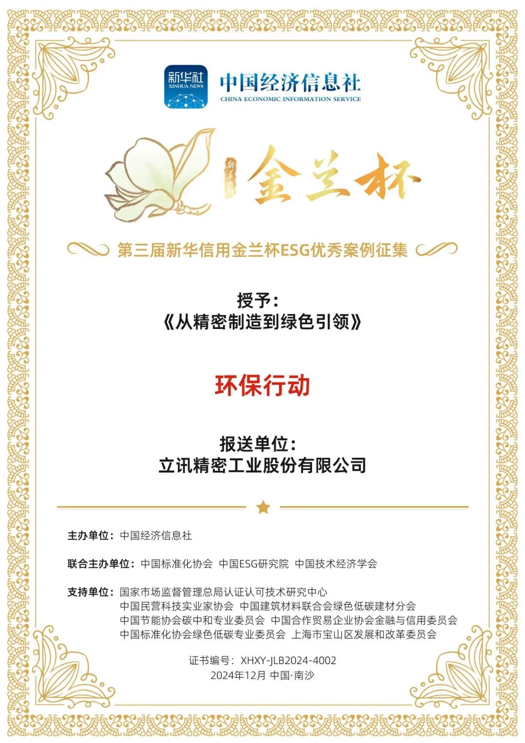 12月8日至9日,以“全球合作 綠色未來”為主題的2024年明珠灣國際氣候投融資大會在廣州舉辦,會上,第三屆新華信用金蘭杯ESG優(yōu)秀案例名單正式發(fā)布。立訊精密申報(bào)的《從精密制造到綠色引領(lǐng)》案例,憑借在低碳環(huán)保方面的卓越實(shí)踐與成果,成功入選新華信用金蘭杯—環(huán)保行動優(yōu)秀案例。