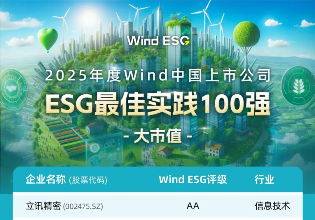 9月9日,Wind ESG重磅發(fā)布“2025年度Wind中國上市公司ESG最佳實(shí)踐100強(qiáng)”榜單,憑借在ESG披露與管理質(zhì)量方面的卓越表現(xiàn)和持續(xù)提升,立訊精密榮耀登榜。