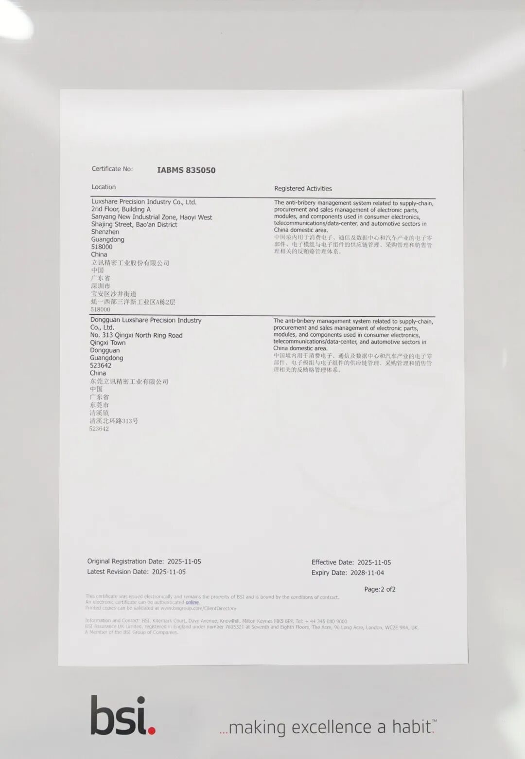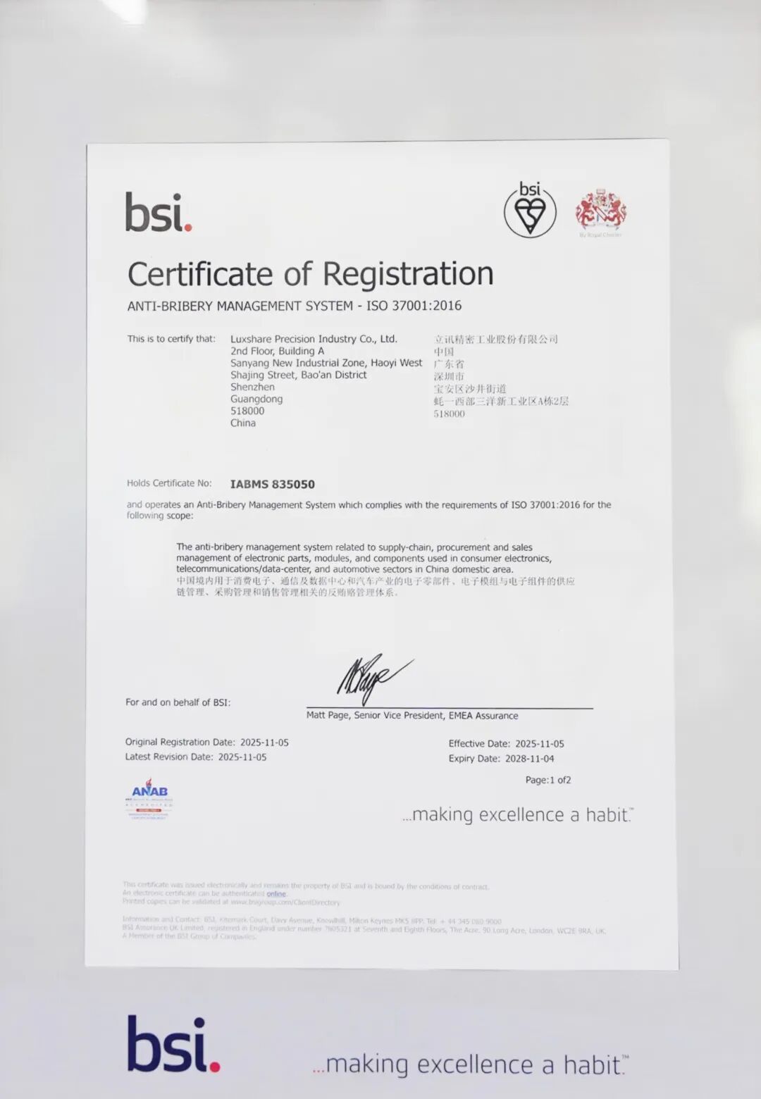 12月9日,全球權(quán)威標(biāo)準(zhǔn)機(jī)構(gòu)英國標(biāo)準(zhǔn)協(xié)會(BSI)正式向立訊精密頒發(fā)了ISO37001:2016反賄賂管理體系認(rèn)證證書。這標(biāo)志著立訊精密深化廉潔建設(shè)、推進(jìn)可持續(xù)發(fā)展征程,邁出了堅(jiān)實(shí)且關(guān)鍵的一步。