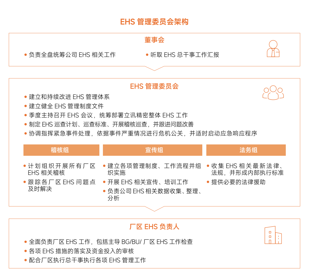 我們建立了由董事長擔任主席的EHS管理委員會,由EHS委員會主導,各工作小組和廠區(qū)相關(guān)負責人執(zhí)行的安全管理架構(gòu)。積極開展季度安全會議,建立安全管理系統(tǒng),對各廠區(qū)進行風險評估并依計劃實施安全巡查工作